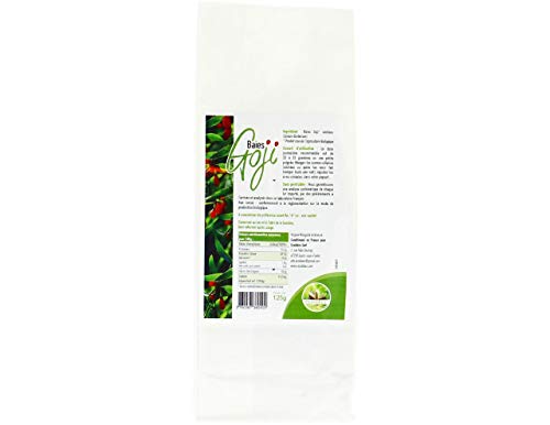 Baies de goji* séchées. *Issues de l’agriculture biologique. Valeurs nutritionnelles pour 100g :Energie : 195 kcal Matières grasses : 5,7g Glucides : 21g Fibres : 9,3g Protéines : 10,6g Fer : 8,42g Vitamine C : 306mg