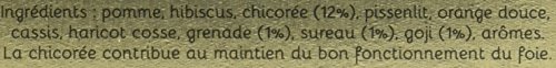Pomme, hibiscus, chicorée (12%), pissenlit, orange douce, cassis, haricot cosse, grenade, sureau, goji, arômes